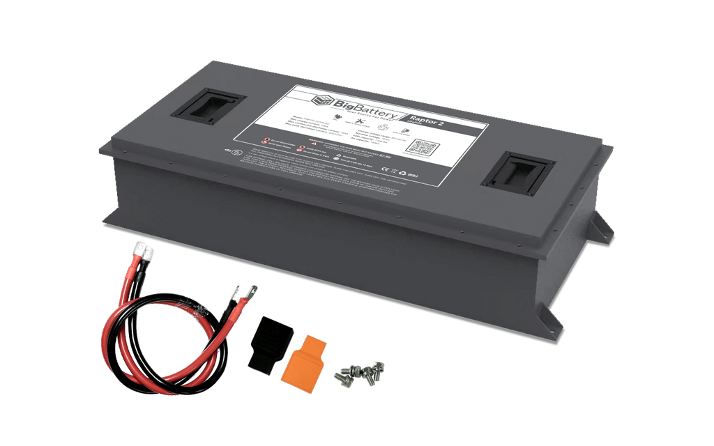 he BigBattery Raptor 2 (72 V 7.68 kWh) is a high-performance lithium iron phosphate (LiFePO₄) battery system built to deliver reliable, safe, and sustained power for electric vehicles, golf carts, industrial machinery, and off-grid applications. Engineered for heavy-duty performance, it provides outstanding energy density, fast charging capability, and long cycle life—all in a compact, maintenance-free design.