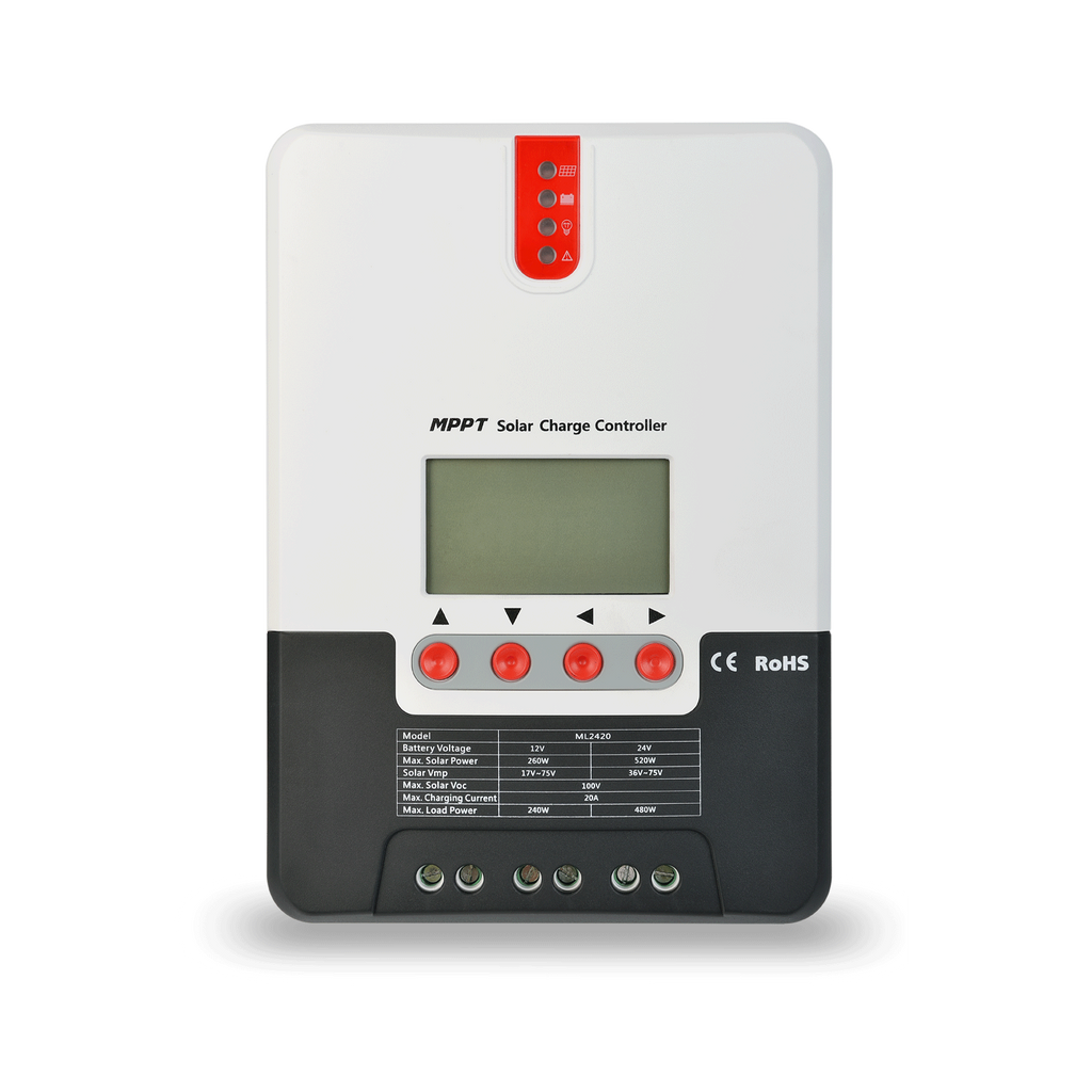 The SRNE ML2430 is a compact 30A 12/24V MPPT solar charge controller designed for off-grid residential, RV, and small battery system applications requiring quiet natural cooling, flexible load control, and integrated PV, battery, and load management in a single unit.